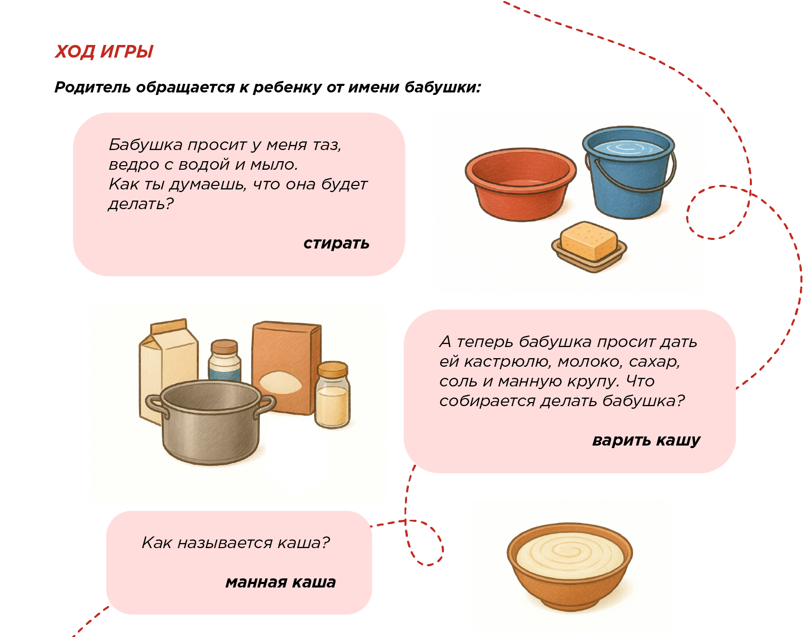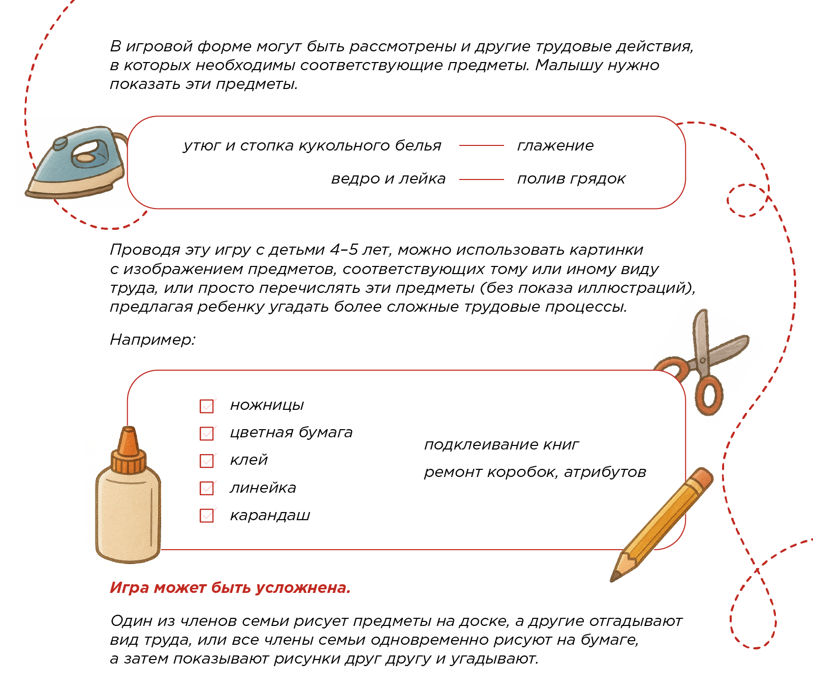 Данная игра позволит уточнить представления детей о некоторых трудовых действиях; о материалах, инструментах и оборудовании, необходимых для работы.